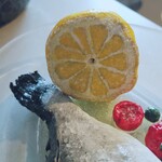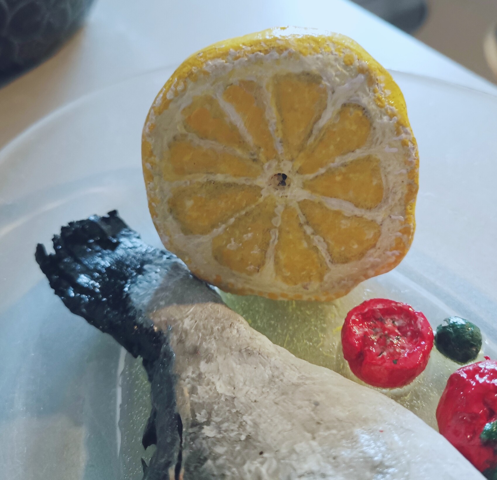 Poisson entier en papier mâché, façonné et peint à la main, présenté sur un plat avec citron et tomates. Cette pièce décorative joue sur l'effet trompe-l'œil grâce à un travail soigné des textures et des finitions brillantes. Œuvre artisanale unique, destinée à la décoration ou à la mise en scène.