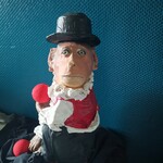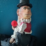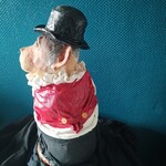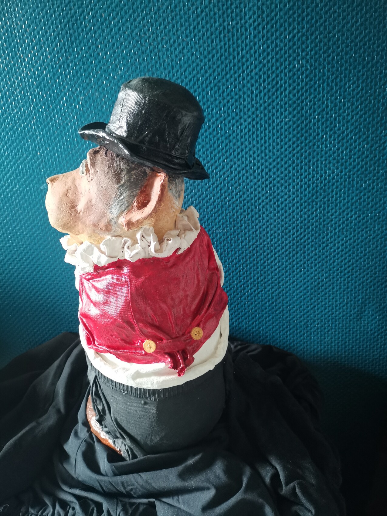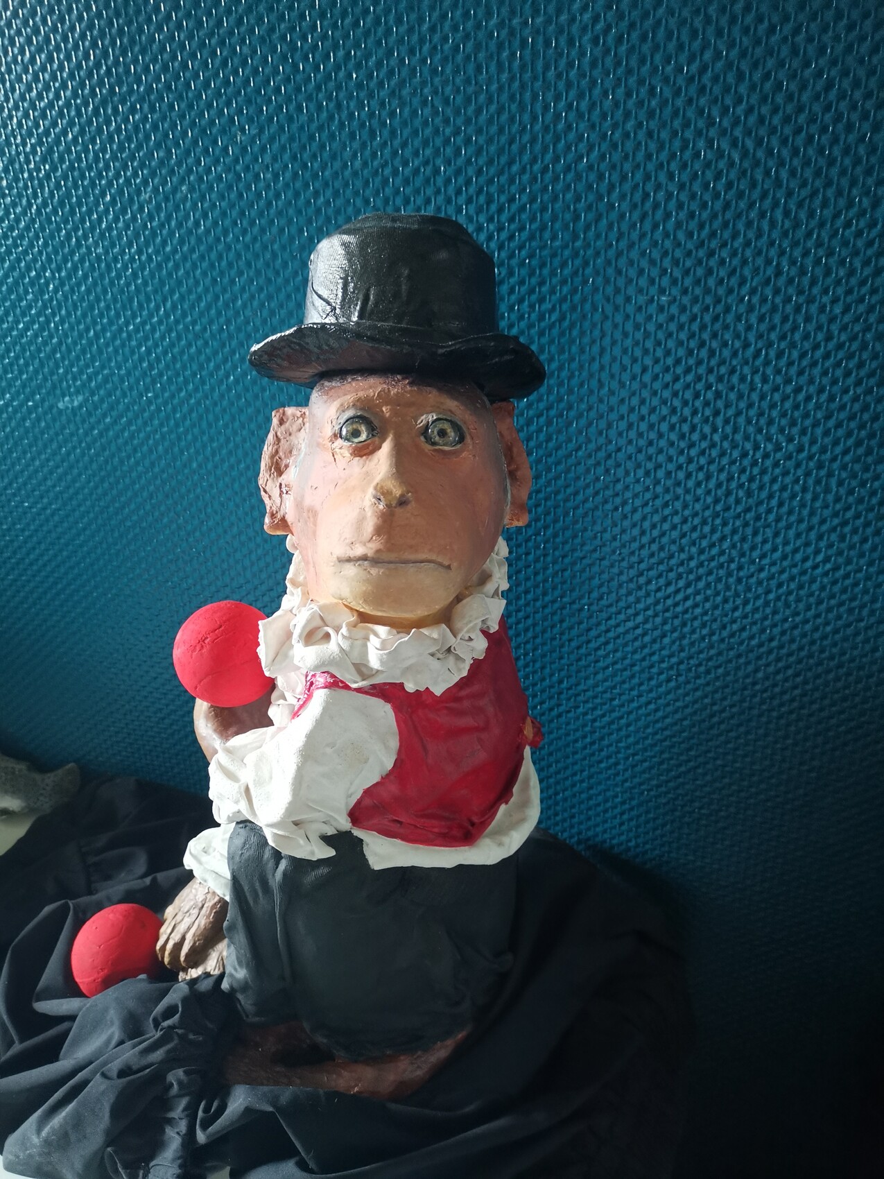 Singe avec son chapeau melon en papier mâché. Tout est peint à la main. Le costume est en tissu véritable. Œuvre unique
